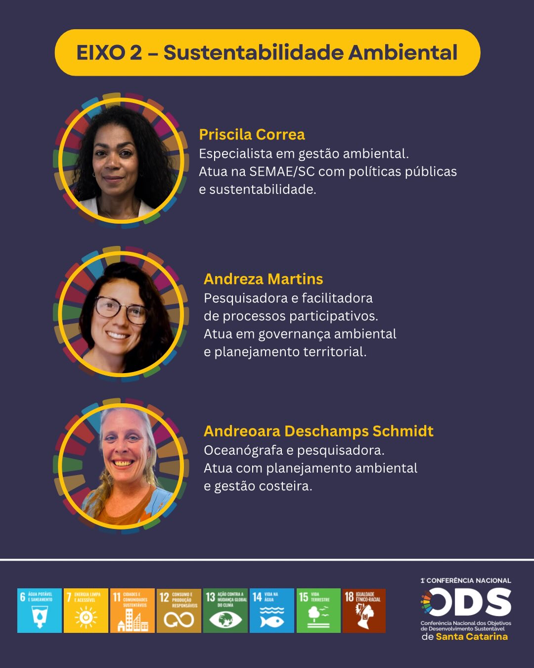 No Eixo 2, que vai discutir Sustentabilidade ambiental, colaboradoras da SEMAE vão atuar como facilitadoras, conduzindo os debates: Andreoara Schmidt, oceanógrafa e pesquisadora; Andrea Martins, pesquisadora; e Priscila Correa, especialista em gestão ambiental. O eixo vai abordar o tópico “Quais medidas práticas devem ser propostas para que as cadeias produtivas assegurem a preservação dos recursos naturais e da biodiversidade, fortalecendo a resiliência climática nos territórios?”. Mais informações sobre o evento podem ser acessadas em https://sc.movimentoods.org.br/santa-catarina-convoca-a-1a-conferencia-estadual-dos-ods-e-mobiliza-sociedade-para-construir-solucoes-sustentaveis/.