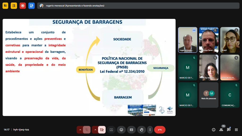 A primeira palestra do encontro foi conduzida pelo mestre e doutor em Recursos Hídricos, Rogério Menescal. Com o tema “Panorama geral sobre os Planos de Segurança de Barragens e PAE”, Menescal trouxe o panorama nacional da implementação da Política Nacional de Segurança de Barragens, seus princípios, lacunas, desafios e avanços, etapas de implementação pelo empreendedores, e ainda, os aspectos essenciais para o fortalecimento e evolução da governança.