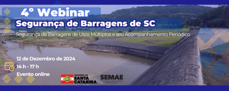 A Secretaria de Estado do Meio Ambiente e da Economia Verde de Santa Catarina, por meio da Gerência de Saneamento e Gestão de Recursos Hídricos e da Gerência de Outorga e Controle dos Recursos Hídricos, convida para o 4º Webinar Segurança de Barragens, que ocorre no dia 12 de dezembro, das 14h às 17h, de … Continue lendo Webinar sobre segurança de barragens de Santa Catarina está com inscrições abertas